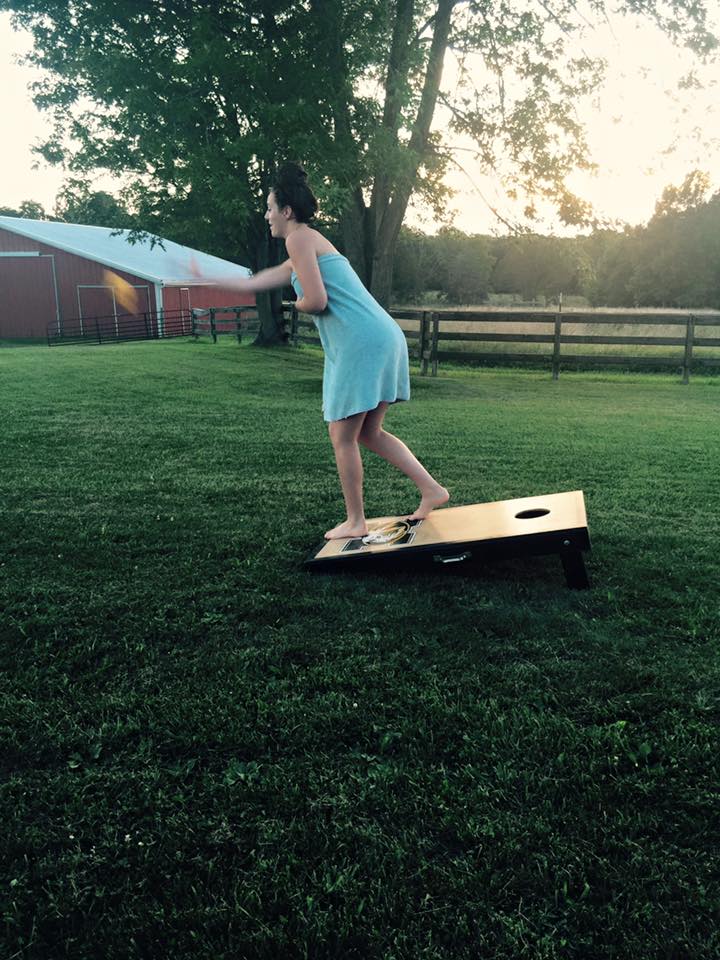 Fact: Sophi got out of the shower and played corn hole in her towel. Things like this really do happen in our home.